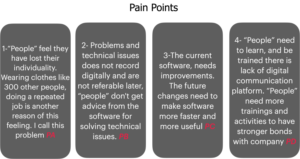 | PB | People don’t document the problems digitallyPeople don’t communicate enough | “People” experience same problemsRepeated mistakes occurs all the time | People be able to discover technical problems and offer solutions People communicate through company platform SB |